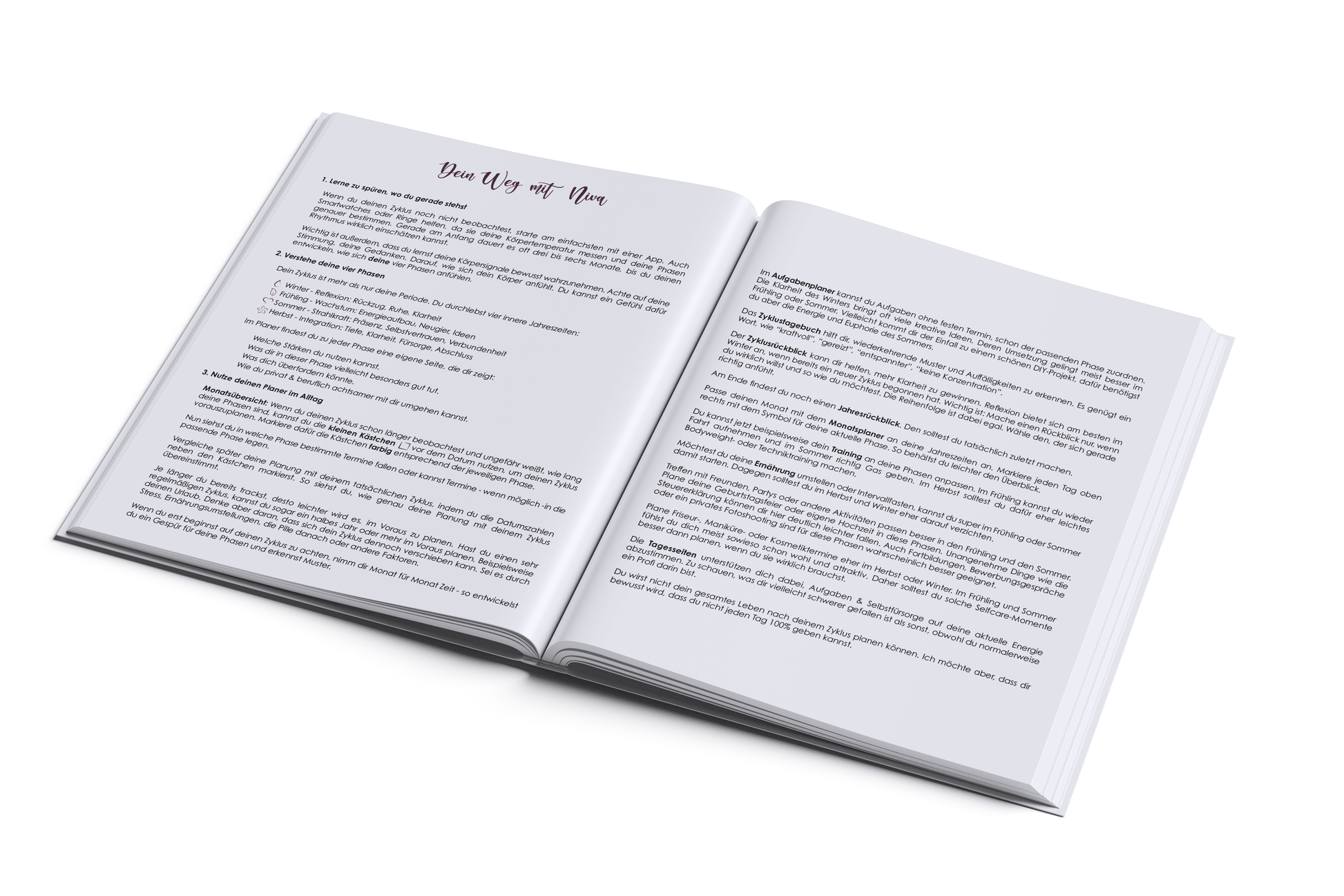 Der Niva Planer verbindet klassischen Kalenderaufbau mit zyklusorientierter Selbstreflexion. Neben Monats- und Wochenübersichten findest Du Zykluswissen, Reflexionsfragen und Platz für persönliche Einträge – speziell auf die vier Zyklusphasen abgestimmt.